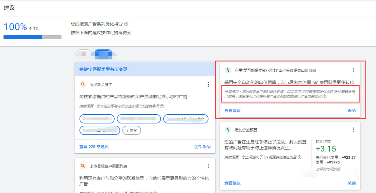 前面我們提到了在運營(yíng)谷歌賬戶(hù)的時(shí)候要添加賬戶(hù)的轉化追蹤,并且將最終轉化目標添加到轉化次數列中,這也是為了我們在積累了一定的轉化數據以后使用智能出價(jià)策略。一般我們建議在人工出價(jià)的廣告系列轉化數量月累計超過(guò)30個(gè)之后,就可以選擇智能出價(jià)來(lái)優(yōu)化賬戶(hù)。