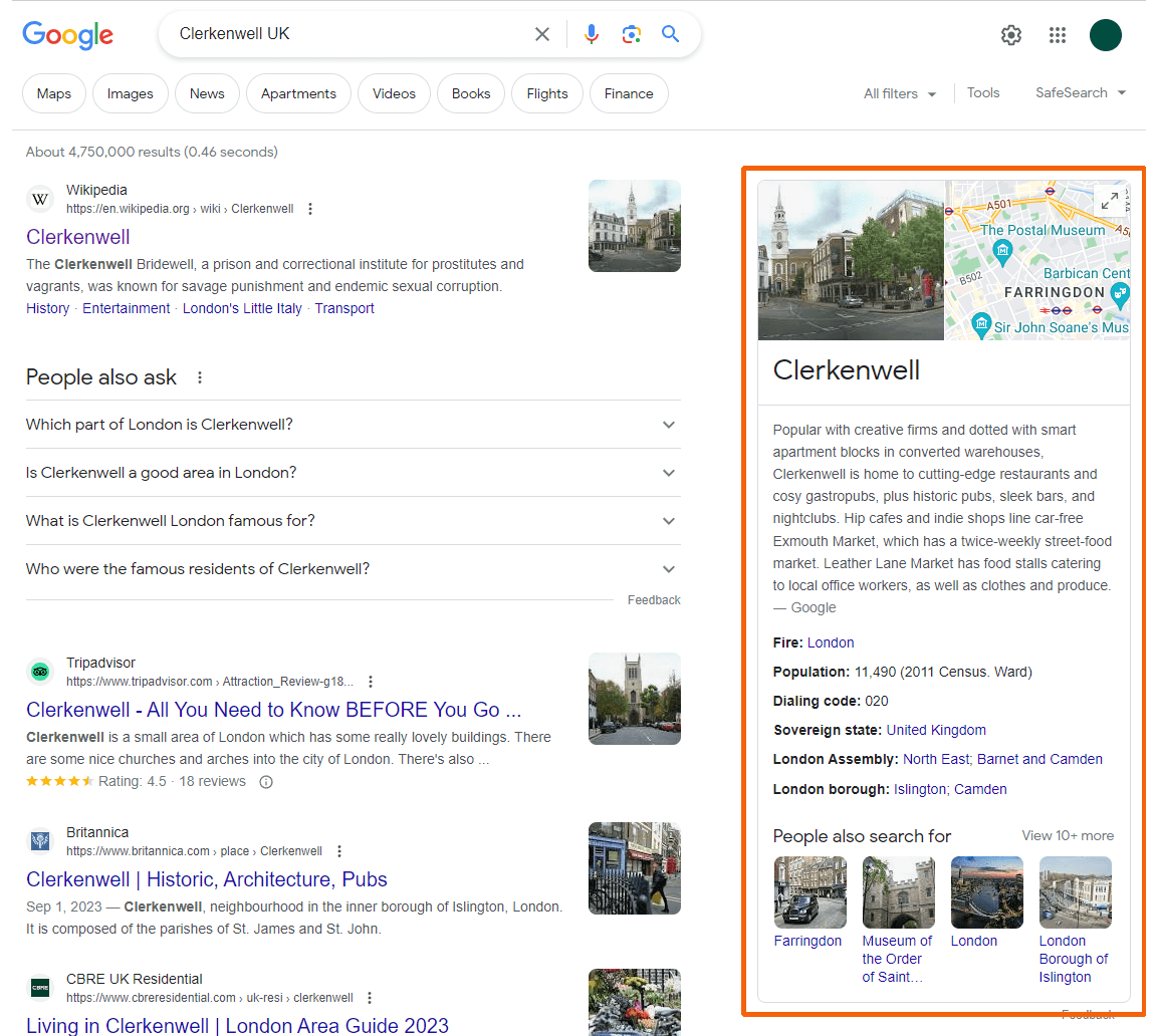 這些是出現在谷歌搜索結果右側的知識框。它們出現在零點(diǎn)擊搜索和簡(jiǎn)短查詢(xún)中: