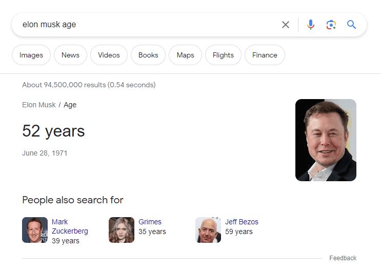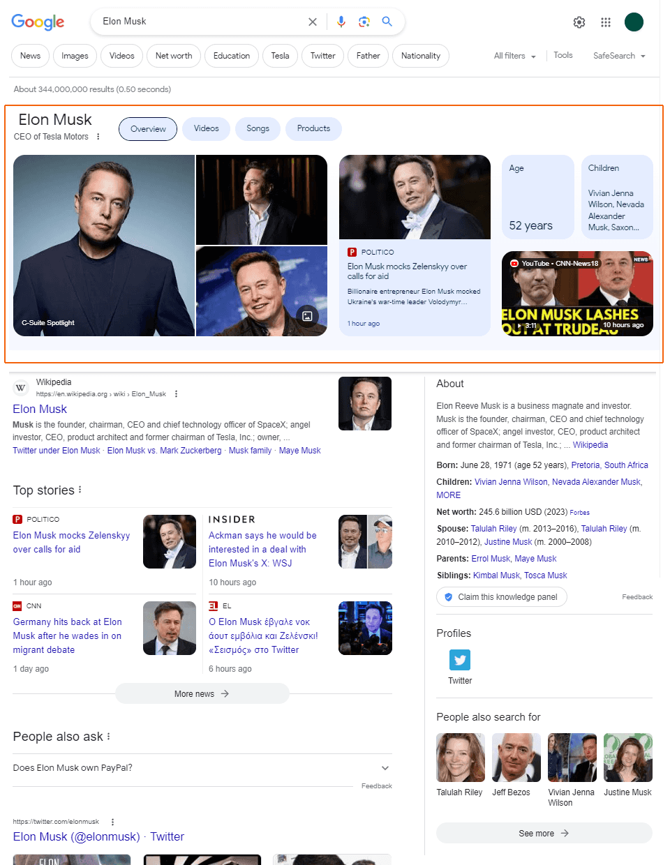 帶有各種信息框的知識面板。請注意,"年齡 "和 "子女 "框分別鏈接到新的谷歌搜索 "埃隆-馬斯克出生 "和 "埃隆-馬斯克子女"。